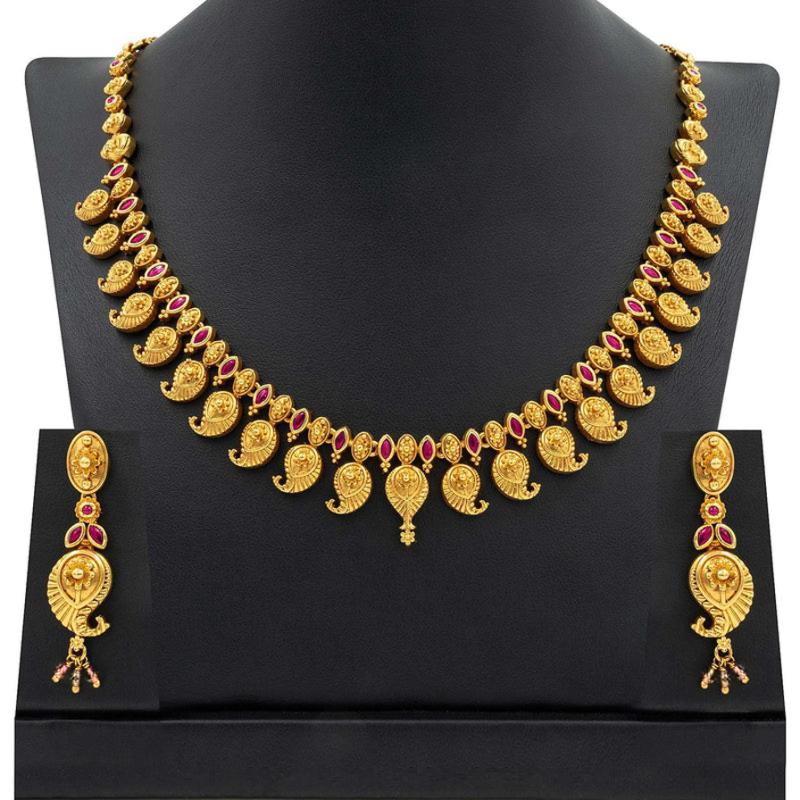 Sreshta Collection Geru Necklace with Earring is a traditional jewelry set inspired by temple-style designs. Crafted with a geru (antique gold) finish, it features intricate patterns and a rich, heritage look that complements ethnic wear like sarees and lehengas. The matching earrings enhance the overall elegance, making it ideal for weddings, festive occasions, and cultural events.